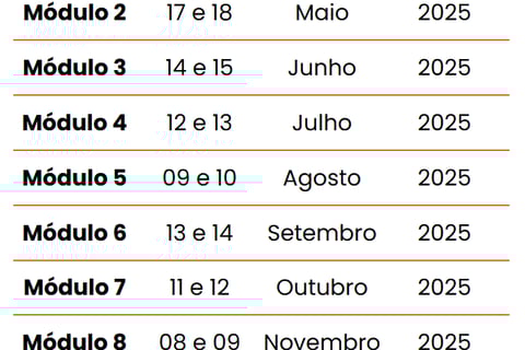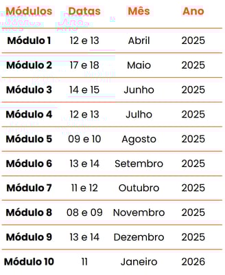 Carga horária de 260 horas, com encontros um final de semana por mês (sábado e domingo) online via Zoom